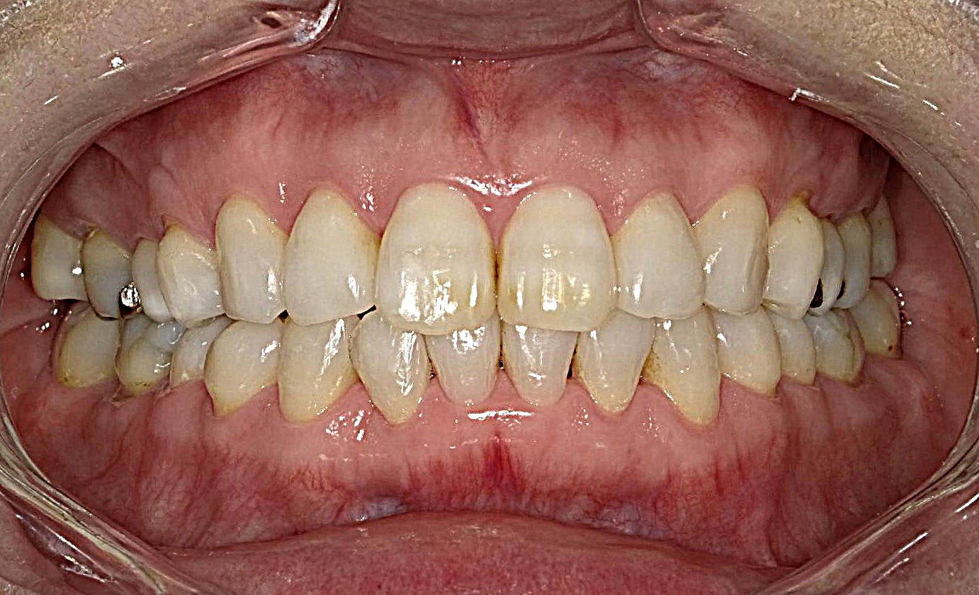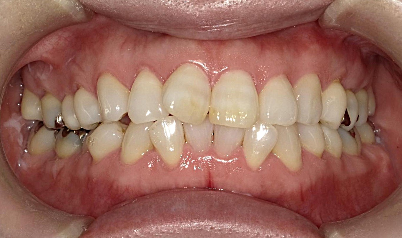 症例 前歯部凸凹 50代女性 2026.04.24 症例 治療前 治療後 術名 マウスピース型矯正装置(インビザラインモデレートプラン・薬機法対象外) 年齢 50代女性 主訴 前歯の凸凹 診断名 叢生(そうせい) 治療内容 奥歯の遠心移動と歯列の側方拡大、IPR(歯と歯の間のヤスリ掛け)を併用し、前歯を突出させることなく、前歯部の凸凹を改善 治療期間 1年9か月 費用 ¥540,000-(税別) リスク、副反応 歯および口腔粘膜の痛み・歯の動揺・歯肉退縮・歯根吸収・歯髄壊死・矯正治療後の歯の後戻り 上下前歯部叢生(凸凹)40代 前の記事